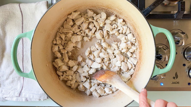 - Add the chicken and saute until just starting to brown (about 10 minutes).