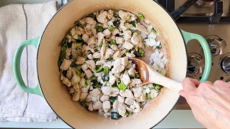 - Add the poblanos and onion and cook, stirring occasionally, until the vegetables have softened (about 5 minutes).