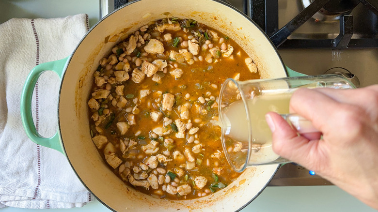 This white chili does not have a typical tomato, red meat, and red bean base of ingredients that gives traditional chili its deep red color. That said, Kinnaird says that you can vary this recipe in a number of ways to create your own delicious spin on this unusual dish based on your preferences or what you have on hand. Since there are so many types of white beans, you can switch up the navy beans for plump butter beans or cannellini beans, which are actually white kidney beans, making them closer to a traditional chili ingredient.