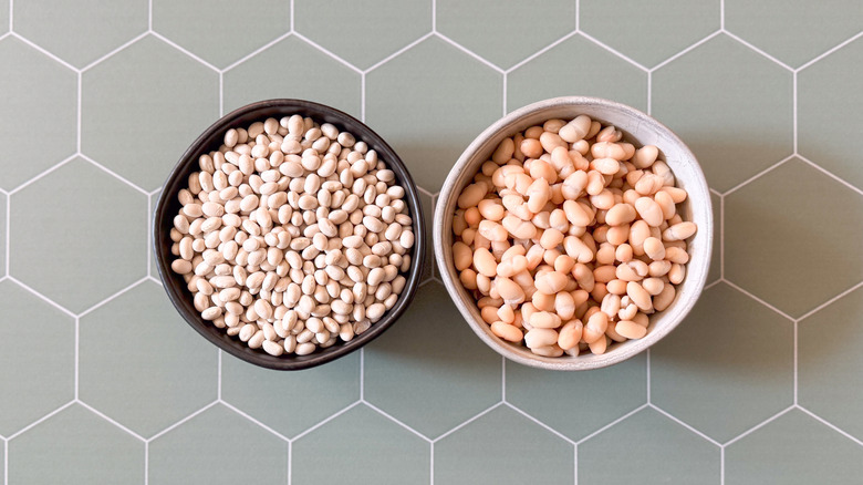 If you have ever shopped for white beans in dried or canned form you may have noticed a plethora of choices in your grocer's aisle, from crescent-shaped butter beans to plump cannellini and the great northern variety. Each of them has a distinct flavor and texture, and they're all useful types of precooked beans to have on hand. The tiny humble navy bean (also called "white pea" or alubias chica in Spanish) originated in Peru several thousand years ago. The beans eventually earned their common name due to their high nutritional value, low cost, and long storage life, making them a useful standard ration for U.S. Navy sailors. Although they are the smallest of the white bean varieties, navy beans are an excellent source of fiber, with 11 grams per 100 grams of beans.