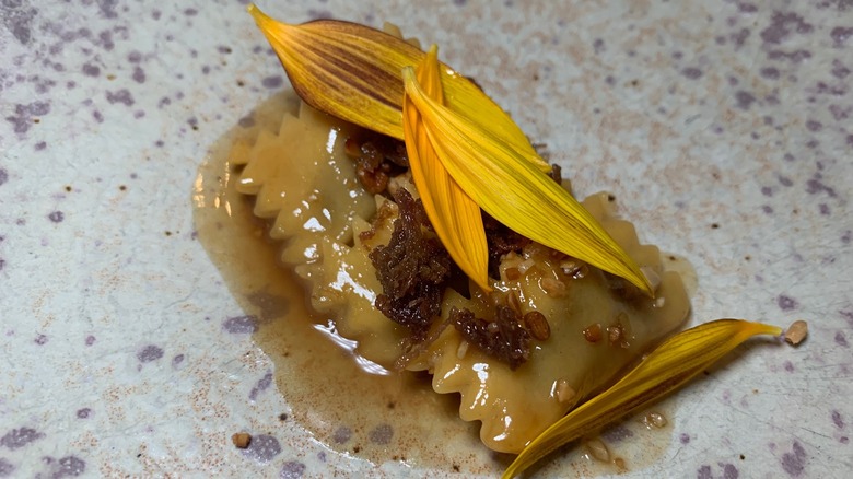 Pasta|Bar is a Michelin one-starred restaurant that only offers a 12-course tasting menu centered around pasta. Not all of the 12 courses are pasta, of course, but quite a few are. The $245-per-person experience starts with a welcome cocktail at the front bar before being escorted into the main dining room. There are usually at least four pasta courses throughout the dinner. There may be a ravioli or agnolotti course, filled with a seasonal ingredient which can vary from crab to sunchoke to duck confit.