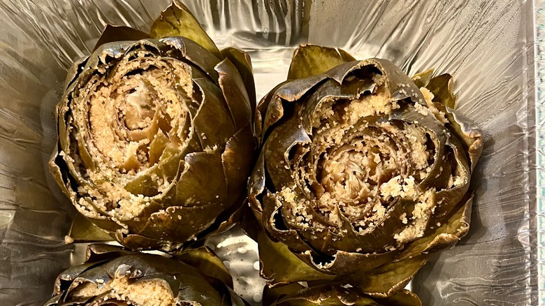However, Sinatra needed a slight adjustment in the ingredients in order to eat this dish: less garlic. A lot less garlic. Practically removed, if possible. He actually liked the flavor of garlic but had trouble eating it because it didn't sit well with his stomach. In many cases, that meant cooking with garlic just enough to infuse its flavor into the dish before discarding the actual garlic before serving. In the case of stuffed artichokes, the recipe that normally called for a number of cloves was modified so that there was only one clove used for four separate stuffed artichokes.