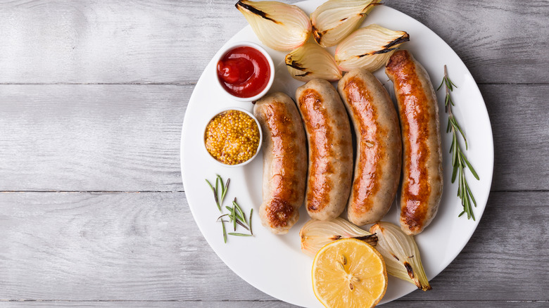 Bratwurst is a staple of German cuisine, so it's best served with ingredients we tend to associate with Oktoberfest, like a pretzel bun and caramelized onions. If you're the type of person who's morally against burgers without cheese, try topping the bratwurst patty with a slice of quality German cheese as it finishes cooking. Some good choices are Allgäu Emmental and Tilsit. Along with pretzel rolls, ciabatta and brioche buns also make a great foundation for this hearty meal. For sides, go for classic German fare like coleslaw, roasted vegetables, and herbed potato salad.