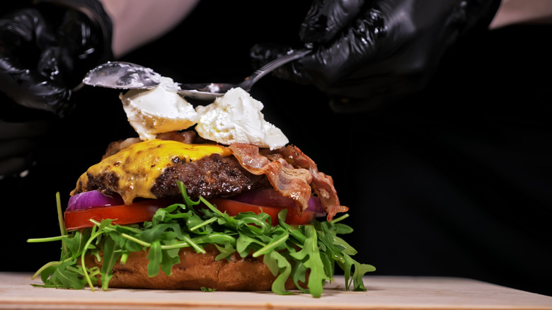 The mellow-mannered taste of ricotta can amplify the flavor of other burger toppings, granting you the freedom to experiment with creative fixings without worrying about how they'll mingle with the cheese. Because it's high in moisture, ricotta can also remedy a dry, overcooked burger. Not to mention that it marries well every type of patty from beef and lamb to turkey and chicken, just to name a few. Adding ricotta to a burger is as easy as lathering it atop a patty or smearing it across a toasty top bun. Just make sure to strain ricotta before using it to avoid a sloppy, drippy mess.