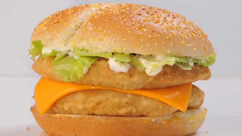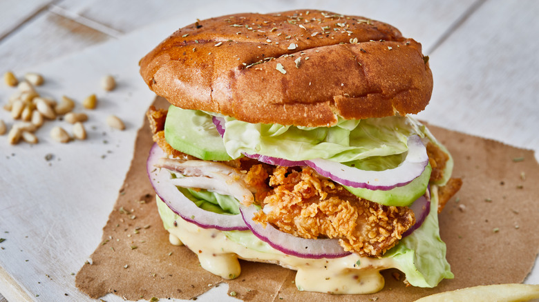 A chicken burger, at least in the United States, strongly mirrors the beef classic; it's simply a poultry-based swap. It consists of a large round patty formed from ground chicken stuffed in between two buns with fixings like lettuce, tomato, onions, mayo, and the like. However, the patty comes together a little differently due to the practicalities of ground chicken meat. Since the protein is less firm, it requires additional binders — eggs and breadcrumbs are popular candidates. Furthermore, the meat is fragile, so pan or deep-frying is more common than grilling. Such preparation techniques blur the lines between chicken sandwich and burger.