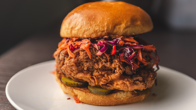 One version of the modern fried chicken sandwich's origin story comes by way of the South. The story goes that in 1946, Atlanta entrepreneur S. Truett Cathy invented the fast food classic. If that name sounds familiar, that's because he went on to open the first Chick-fil-A in 1967. Today, the brand's version with pickles on a buttered bun still offers a taste of the original. But thanks to fried chicken's dual Scottish-African American ancestry, deep-fried chicken flavored with a buttermilk marinade and spices is the default American chicken sandwich today.