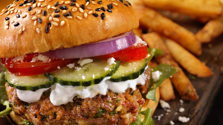 When it comes to fixin's, you can double down with crumbled or sliced feta on top of your burger in place of your typical cheese. You can also lean into the Mediterranean mindset by drawing inspiration from a Greek salad with halved Kalamata olives, marinated red onions, or slices of cucumber, or the flavors of Greek dressing with oregano, mustard, and garlic. You can even create a creamy topping by combining those elements with Greek yogurt. Alternately, fold a couple of ounces of feta into a little mayo along with your choice of herbs (like parsley and mint), and a squeeze of fresh citrus. These Greek-themed spreads offer a deliciously cool contrast to your hot-off-the-grill, caramelized patty.