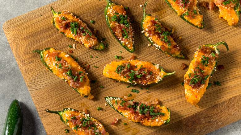A cheese ball recipe, whether it's made with tuna or not, is easy to stuff inside your cut peppers like you would cream cheese, but also includes other flavors like onions, garlic, bacon, nuts, ranch dressing, and Worcestershire sauce, giving your poppers a wholly umami, sometimes smoky flavor that plain cream cheese lacks. Additionally, you can also take inspiration from popular types of stuffing for dishes like stuffed mushroom. For instance, add panko breadcrumbs to your cheese for a creamy, savory, crunchy mixture that tastes just as delicious inside peppers, too. To make the flavor more memorable, skip the plain stuffed mushroom mix and go with one that includes seafood like crab or use a cheesy smoked sausage mixture.