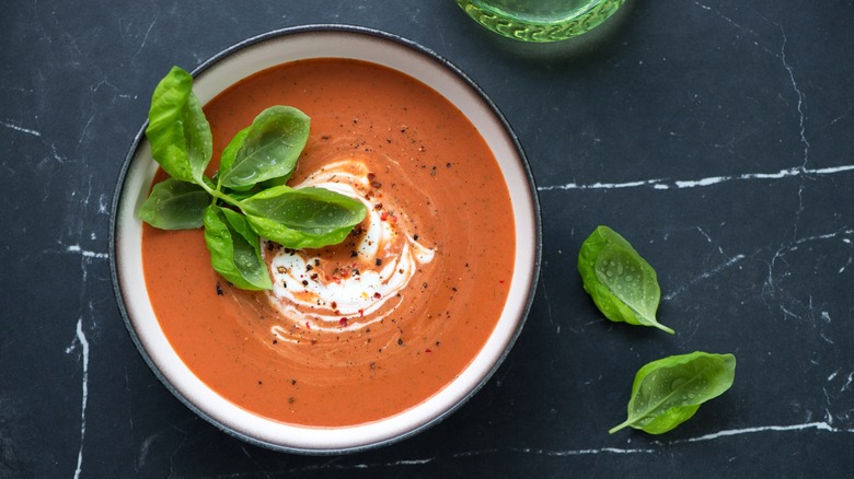 If you're specifically looking to lower the fat content of your meal, but you don't want the thin, watery soup you might get with milk, you can try plain Greek yogurt. This ingredient adds a rich and creamy element but is a lower-calorie option. The slight sourness of the yogurt also complements the acidity of the tomatoes well, and the flavor difference isn't as in-your-face as coconut cream, though it makes your soup a little tangy.