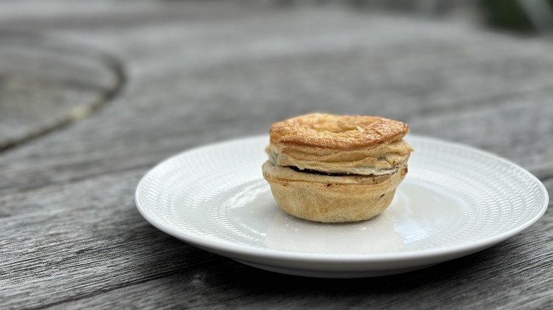 Chicken and mushroom pie is a great example. It's kind of like a mini bacon and egg pie, except the filling is different and it's meant for one. It's also a bit like a savory, in that it has classic umami flavors. But unlike savories, which use what looks to be shortcrust pastry, chicken and mushroom pies are larger, shaped like hand pies rather than little muffins. If your head is spinning, don't worry: Mine was, too, and I had them all laid out at the counter for me.