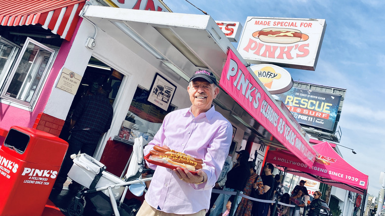 This isn't Richard's first rodeo. At age 15, when he wasn't hitting the books at nearby Fairfax High School, he was working the counter at Pink's. Flash forward to 1986, and his parents Betty and Paul hit a crossroads. Richard remembers, "My parents said ... 'Look, we're too old. We're going to sell [Pink's] unless you want to come in and take it over.'" At the time, Richard was in real estate and Gloria had been working as a school teacher. They took over operations, with Gloria handling marketing and people, and Richard managing licensing and menu creation. (He doesn't let a single dog hit the menu that won't be ordered at least 20 or 30 times every day.) In 2016, Richard walked away from real estate and became a full-fledged hot dog mogul with Gloria handing him the reins and telling him, "'It's been 40 years, you can now do it all.'" You'll still catch Gloria and Beverly — dressed in the brand colors — alongside Richard at every event for anything Pink's.
