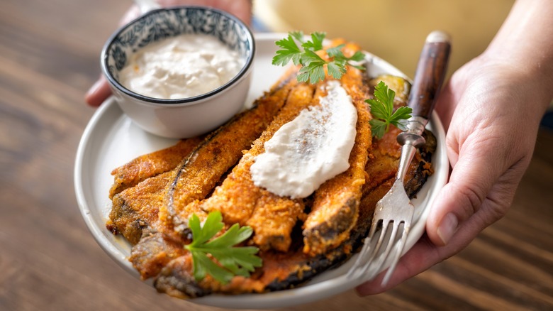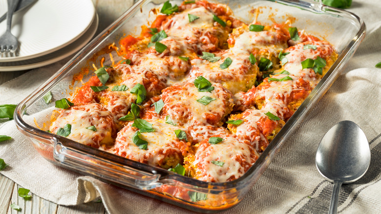 Eggplant Parmesan is a classic dish served at most Italian restaurants. It's made with eggplant that's thinly sliced, fried, and topped with tomato sauce — or for a creamier version, use vodka sauce — and plenty of cheeses like mozzarella and Parmesan. Eggplant Parm is a fairly easy dish to prepare and requires only a handful of basic ingredients, but fried eggplant doesn't always have to be thinly sliced into rounds. You can turn eggplant into crispy fries at home just as easily, and if you top them with sauce and cheese, you can have your own loaded eggplant Parm snack.