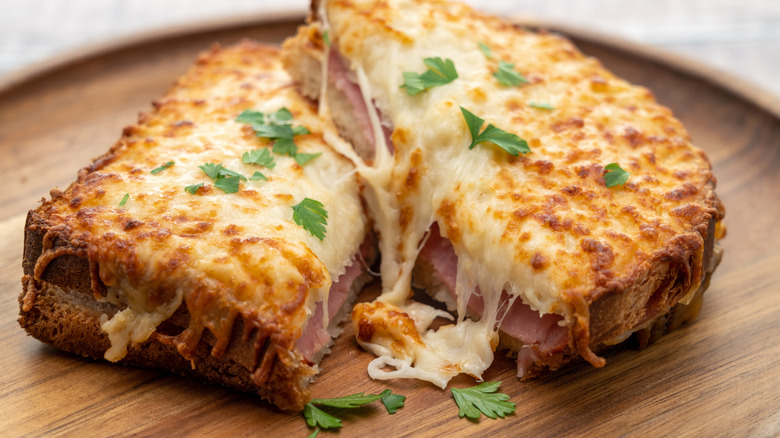 A typical croque monsieur is flavorful, but far from extravagant — while it's meant to be a fork-and-knife sandwich, don't expect thick layers of meat or lots of oozing cheese. It makes for a satisfying quick lunch if you're not too hungry, or a hearty mid-afternoon snack if you have a bigger appetite. If you like the idea of a croque monsieur but want something more substantial, try its close relative, the croque madame — the same sandwich, but topped with a fried egg. If you're curious to make one yourself, try our traditional croque madame recipe.
