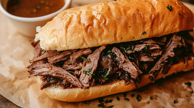 Let's set the record straight: The French dip sandwich — a crusty roll stuffed with hot meat and served with flavorful meat juices for dipping — isn't really French. It actually originated in Los Angeles sometime in the early 20th century. But according to one of its two competing origin stories, the restaurant owner who invented it was a French immigrant, Philippe Mathieu. Numerous variations on Mathieu's story exist, but the overall gist is this: Sometime in 1918, Mathieu accidentally dropped a roll into a pan of drippings while preparing a sandwich for a customer. The customer insisted on taking the sodden sandwich and loved it, so much so that his friends started asking for their sandwiches with a juice dip, too. The newly popular sandwich got its name from Mathieu's ethnicity as well as a fashion trend: At the time, the term French dip referred to a then-popular dropped waistline on dresses.