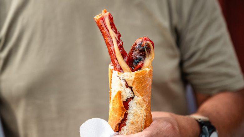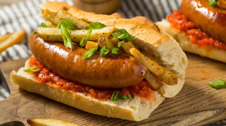 The typical merguez sandwich is a cross-cultural collaboration. It's built on a classic French baguette, split open and spread with harissa, a North African hot red chili paste. On top of this goes the hot sausage and sometimes add-ins such as grilled onions, peppers, or a bit of tomato. To make the sandwich even heartier — and to balance out its punchy flavors — some diners top their sandwiches with a handful of fries, adding another classic French note to the mix.