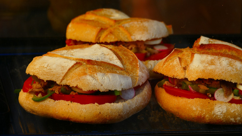 If you've always disliked tuna sandwiches because gloppy mayonnaise mixtures gross you out, pan bagnat – a specialty from the sunny southeast coast of France — may change your mind. This colorful sandwich, filled with a summery mix of tuna chunks, bits of anchovy, vegetables such as tomatoes, radishes, cucumbers, and onions, along with sliced hard-boiled eggs, and generous lashings of olive oil and vinegar, is essentially a handheld salade Niçoise. But what makes the sandwich truly unique — and gives it its name, which translates as "soaked bread" — is the fact that the hearty round rolls used for the sandwich are pressed for an hour or more after the sandwiches are filled. This allows the juices from the filling to permeate the bread, adding another dimension of flavor.