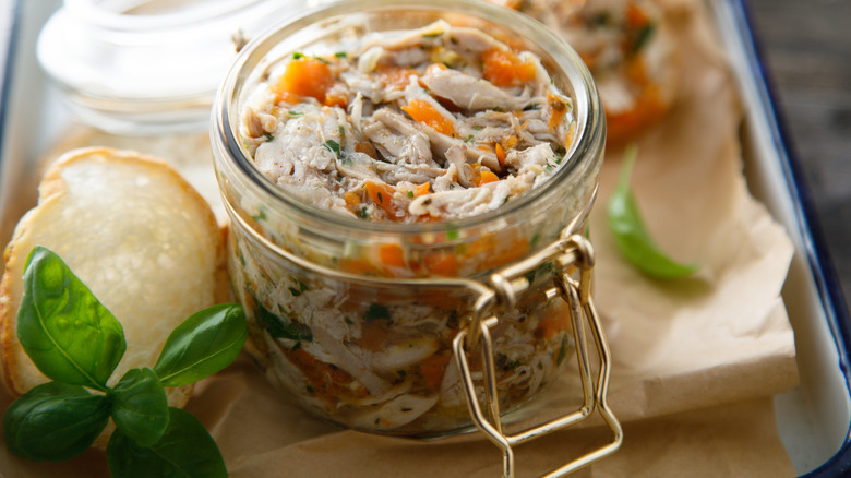 While it's indeed rich (and definitely not a good choice for calorie counters), it doesn't taste like a mere mouthful of fat. It packs a punch in terms of flavor — deeply meaty and savory, typically shot through with aromatics such as garlic and rosemary. And its buttery mouthfeel makes it a great partner for a crispy fresh baguette. A typical rillettes sandwich doesn't contain anything other than rillettes and bread. But it's so powerfully flavored it doesn't need anything more than that.
