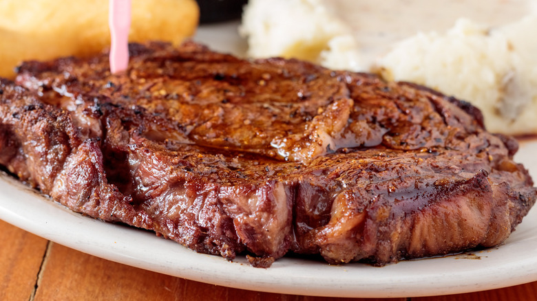 The first step of the Indian Creek Steakhouse food challenge is knowing about it at all, and that's because the 72-ounce steak isn't boldly advertised on the menu. It isn't on the restaurant's website landing pages either; this food challenge is only for people in the know. Several food bloggers and content creators have given it a shot and won the challenge — among them is Raina Huang, a competitive eater who finished the challenge in a little over 18 minutes.