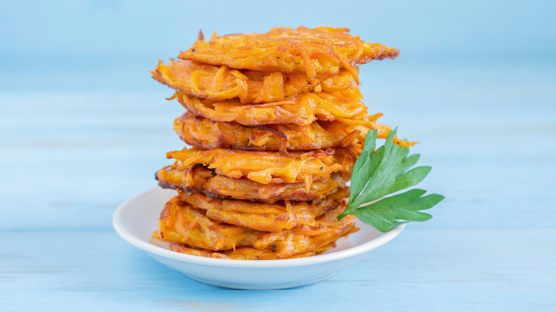 Whether or not you celebrate Hanukkah shouldn't keep you from enjoying some scrumptious latkes, which are classic, fritter-adjacent potato pancakes. They are warm and fluffy on the inside, crisp on the outside, and dosed with flavor from loads of egg, onions, and matzo meal. Traditionally, latkes are garnished with a healthy heaping of applesauce or sour cream to add sweetness or a bit of tartness, but there's another way to infuse sweetness into the latke itself — swapping out traditional white potatoes for sweet potatoes is the latke game-changer you need to try out this holiday season.