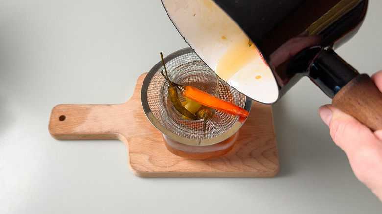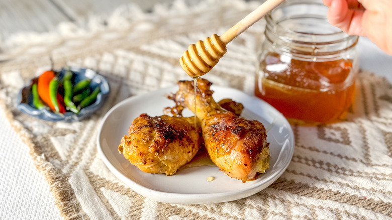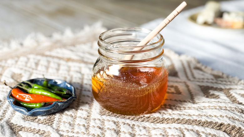 There's no denying that hot honey has gained an abundance of popularity over the years, becoming a sought-after condiment for everything from pizza to fried chicken to Brussels sprouts. The good news is that hot honey is really just as it sounds — honey infused with chiles for the perfect sweet and spicy complement to so many foods. It's the simplicity of hot honey that makes it so magically delicious, playing on that simple but effective flavor combination of spiciness and sweetness. Although there are plenty of hot honey brands to be found on supermarket shelves these days, making it at home could not be easier and also gives you the opportunity to experiment with your own preferred level of heat.