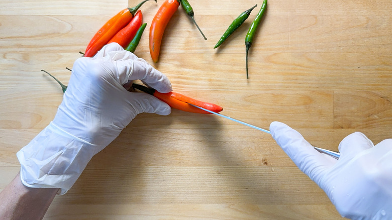 - Wearing gloves to protect your skin, cut slits in each of the chiles using the tip of a small knife.