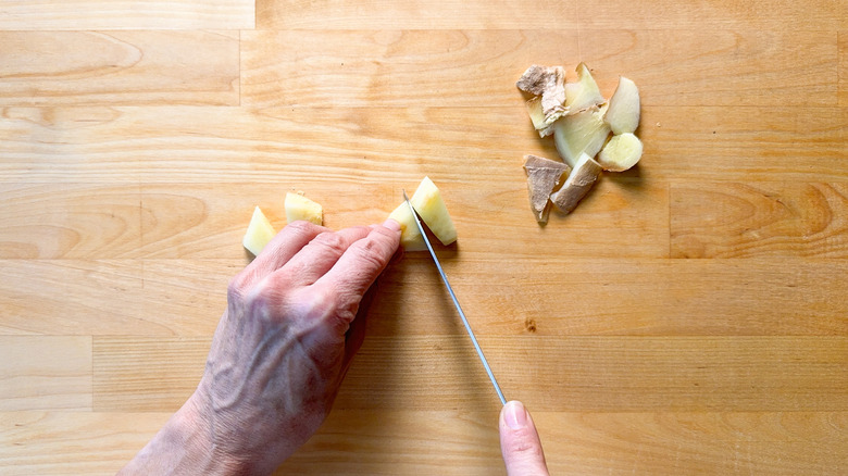 - Remove the peel from the ginger root and cut the ginger into small pieces.