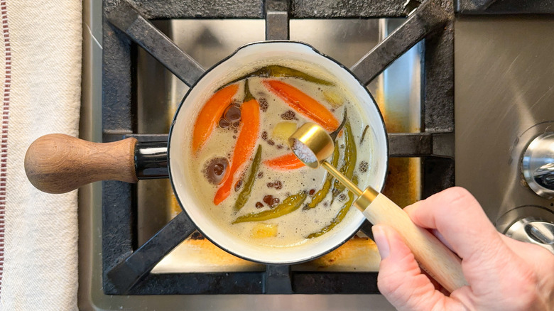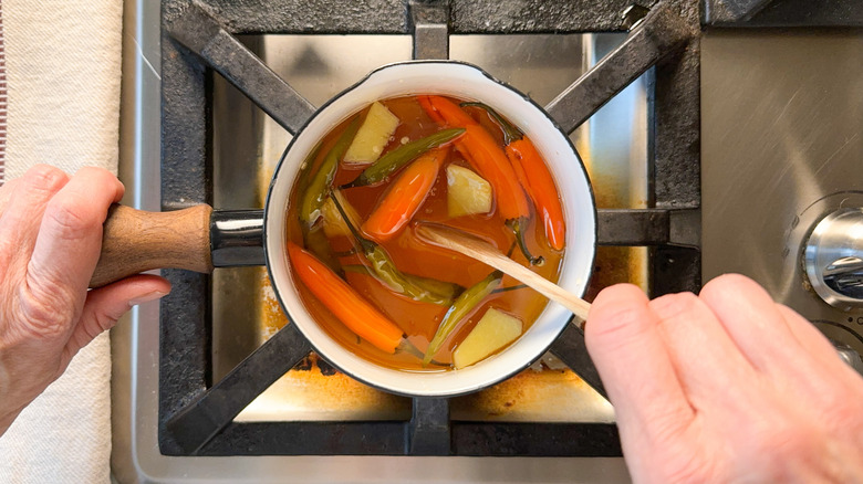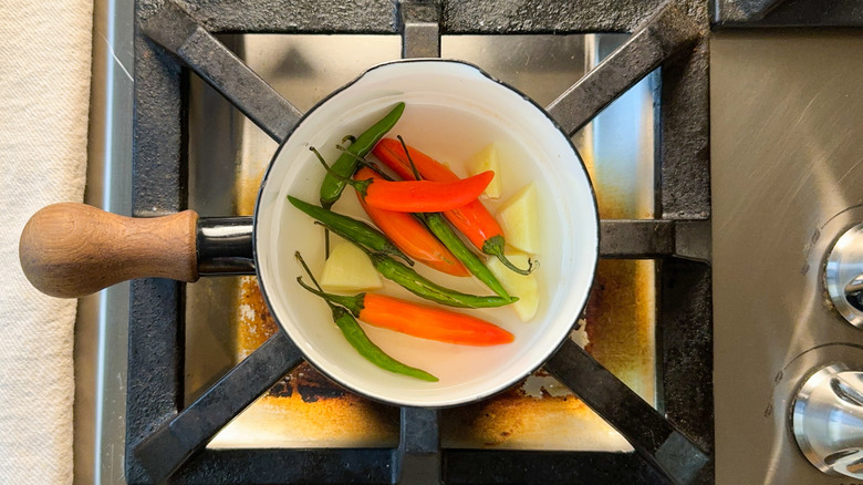 - Add the chiles, ginger, and vinegar to a small saucepan and bring to a boil over medium-high heat.