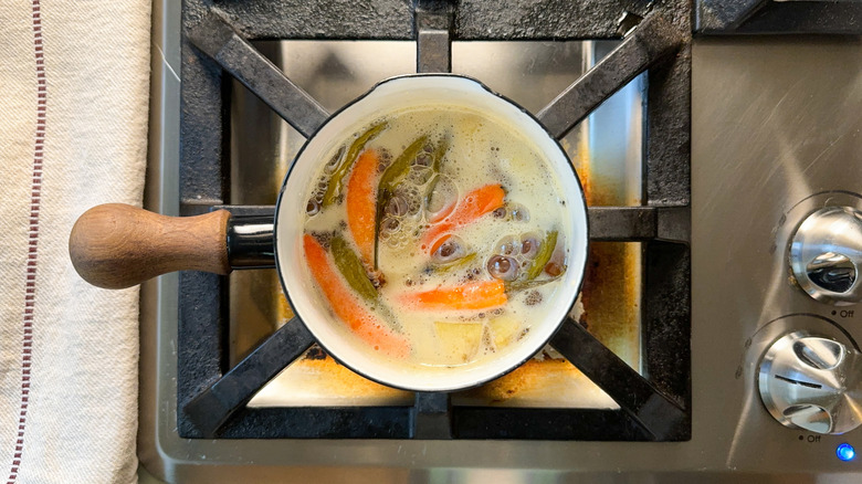 Simmer the mixture until the liquid is reduced by half, about 2 minutes.
