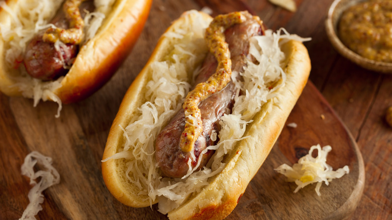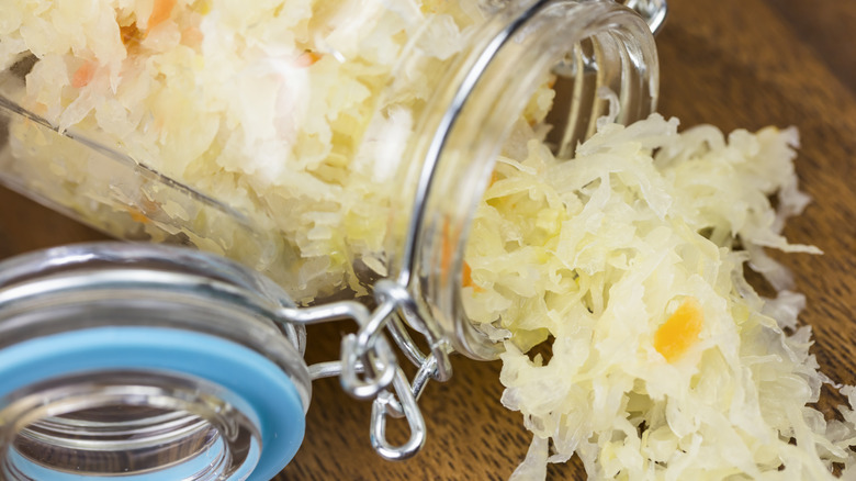 Sauerkraut — which translates to "sour cabbage" in German – is exactly what it sounds like. It's just chopped cabbage that has been fermented to achieve a tangy and sour taste akin to things like pickles. Today, jars of sauerkraut line grocery store shelves, and it's a common condiment that can be found on top of bratwursts or spread on Reuben sandwiches worldwide. Sauerkraut is most often associated with German cuisine, but it actually has a long history that predates its European debut by about 2,000 years and more than 4,000 miles.