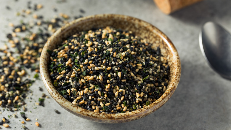Furikake is a seasoning blend often used in Japanese cuisine. It includes dried fish, dried seaweed, sesame seeds, and other ingredients that bring extra salty flavor plus brininess to the burger. This is the seasoning often used with sushi, although it can add umami to plenty of other dishes as well, including popcorn and instant ramen. For burgers, it makes a good topper that also adds a hint of crunch thanks to the seeds in the blend.