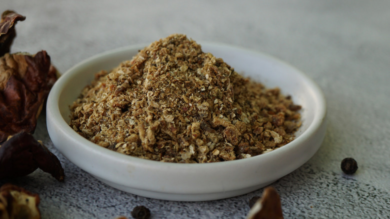 You can make it at home by drying mushrooms in a dehydrator or buy the spice at the store. You might also find blends with chili powder or red pepper for a little extra heat. Mix it with salt if you want to season your burger with both in one step. If you have large pieces of dried mushroom, you may need to grind it into a finer powder to help apply it more evenly across the burger's surface.