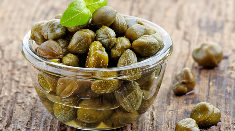 Capers look like tiny olives but they're actually flower buds. They come from caper bushes, which grow mainly in Mediterranean regions. The unopened flower buds are picked by hand and typically bottled in brine. The flavor is slightly salty, tart, and floral. They're the perfect addition to picatta dishes, which consist of breaded and fried meat covered in a lemon-infused sauce. Flay said on Instagram that he has tons of capers on hand to whip up last-minute dishes like fish or chicken piccata. He even commented, "My mouth is watering just thinking about it."