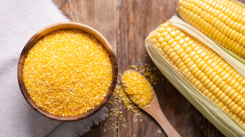 Just like the name suggests, cornmeal consists of coarsely ground yellow corn. It can add texture and a lovely corn flavor to a wide array of dishes like muffins, cakes, and cornbread. It can also provide crunchy breading to deep-fried dishes and add some texture to pizza dough. Cornmeal shouldn't be confused with cornstarch or corn flour though. The latter two are more finely ground and often used as thickeners for sauces. If you can't find cornmeal, grits can be a good stand-in. Grits are essentially cornmeal that's slightly grittier. Polenta may also be a good bet if it's made with corn. Just be sure to check the label though because some polenta is made with grain or another form of starch.