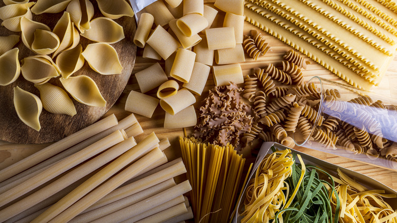 Dried Italian pasta is often made with semola flour, which consists of hard durum wheat. The flour gives the pasta a chewy texture, which is just what you want when you're cooking dried pasta to al dente. Some pasta is also made with 00 flour, which is ground very fine and gives slightly less chew to the pasta. Flay stocks his pantry with a variety of Italian pasta shapes including spaghetti, bucatini, penne, and elbow macaroni. He particularly likes squid ink pasta shells, which he said he uses often when cooking shellfish because it has a unique briny flavor.