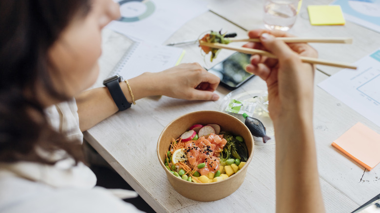 Equal parts satisfying and nourishing, a colorful poke bowl is a fresh yet filling Hawaiian dish. Typically assembled on a bed of rice topped with garden-fresh veggies and raw fish, poke is like a deconstructed sushi roll that's been stuffed into a bowl. Although fresh, uncooked fish is the most common protein source for restaurant-ordered poke bowls, dine-in recipes aren't always as affordable as those we make at home. But don't fret; you can prepare a high-quality poke bowl on a budget by using canned tuna.