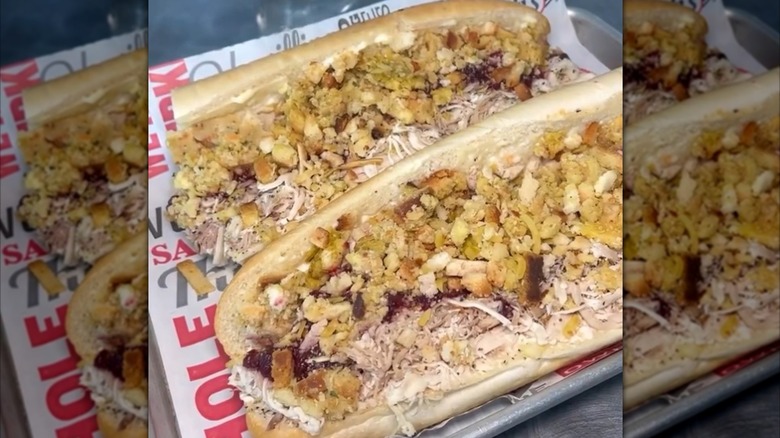 The Bobbie is a post-Thanksgiving treat — albeit one sold year-round at Capriotti's, the sandwich shop that first put it on the menu. The sandwich is a copy of one that the aunt of the shop's owners would make with Thanksgiving leftovers, and yes, her nickname was Bobbie. The sandwich has mayo, shredded roast turkey, cranberry sauce, and stuffing layered on a roll.