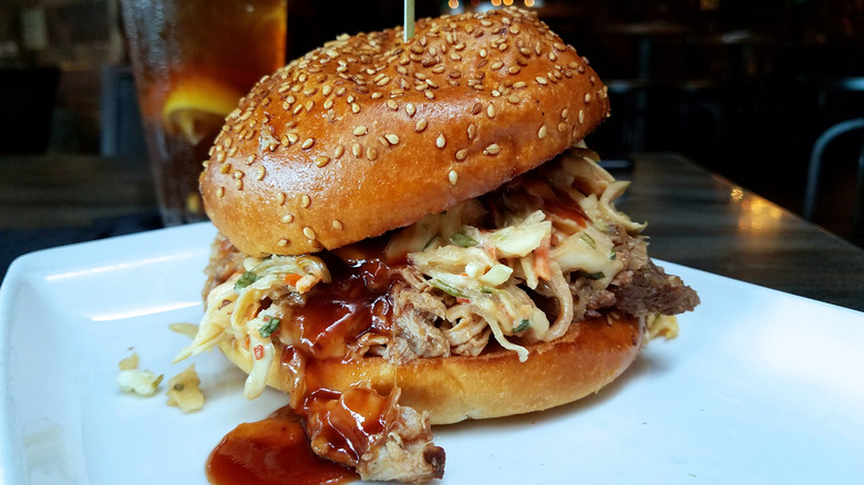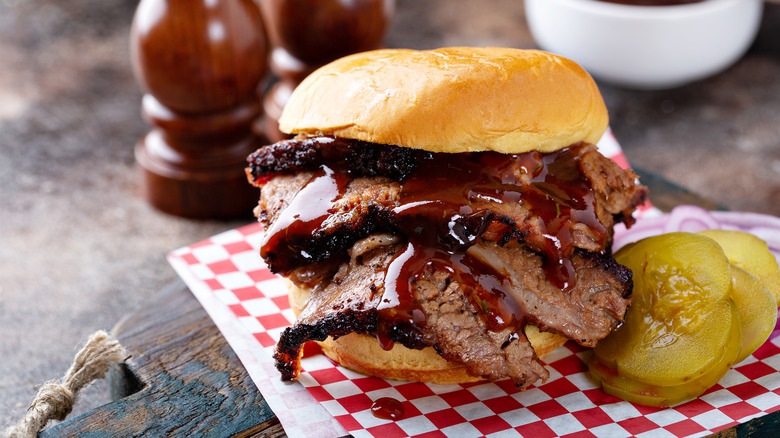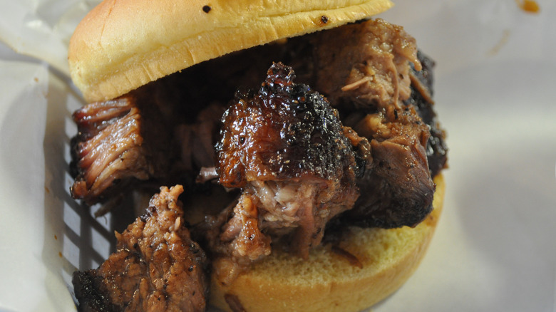 Low temperatures, long cooking times, and indirect heat from smoking turn tough brisket into tender barbecue, and once you slap some sliced brisket between two slices of bread, you have Texas' favorite sandwich. Depending on the restaurant you're at, you may have a choice of toppings, but the meat plus the bread, and maybe a slice of jalapeño, is really all that's required to make this sandwich.