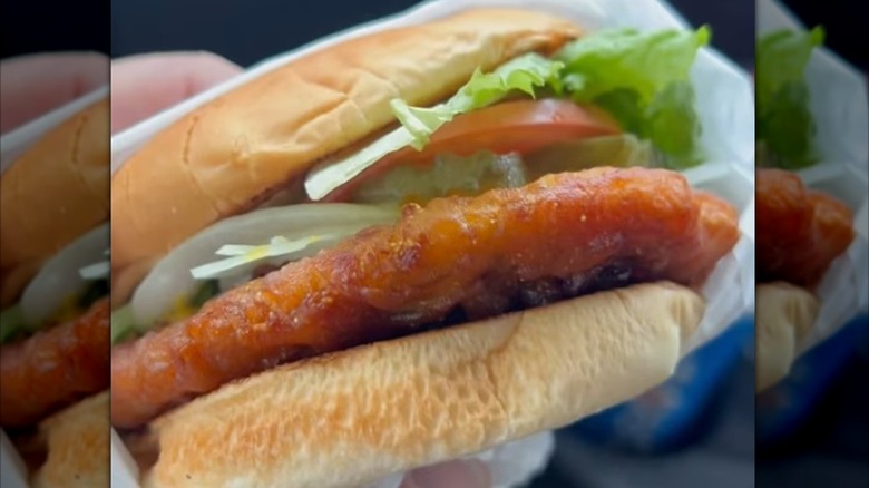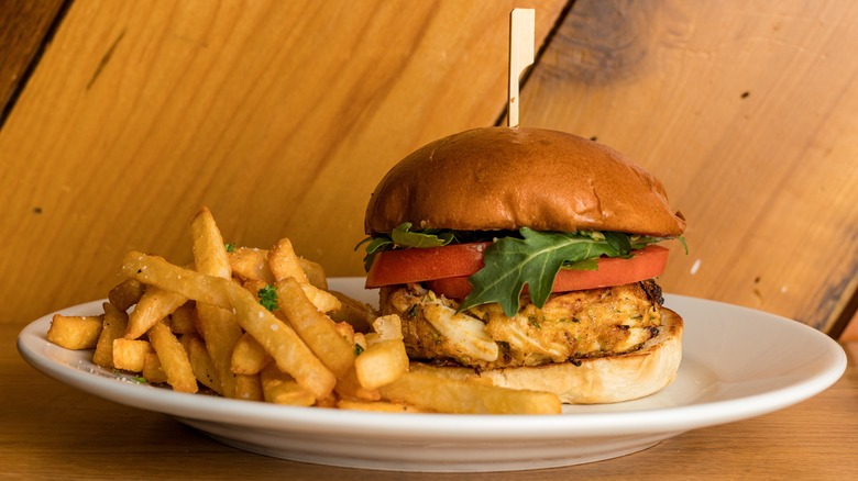 A Maryland-style crab cake is made of lump crab meat (not soft-shell crab!) held together in a loose patty with egg and mayo. Season it with flavors like Old Bay and place that patty on a bun with tomato slices and other toppings, and you have the iconic crab cake sandwich. The sandwich is so popular in Maryland that McDonald's even released a limited version of it back in 1992.