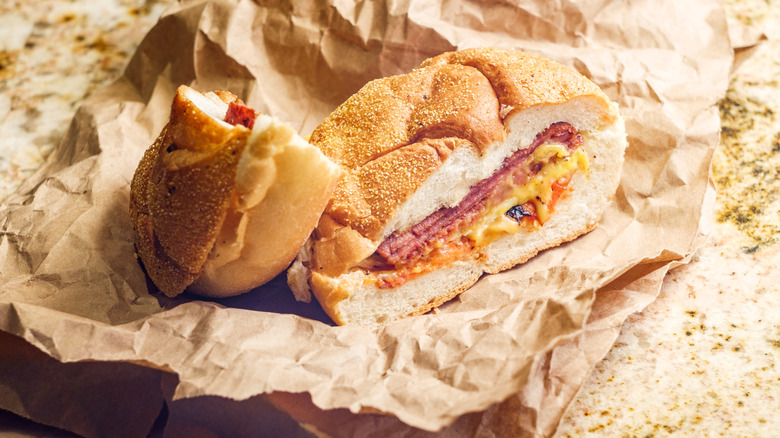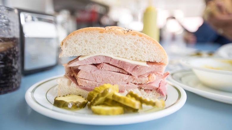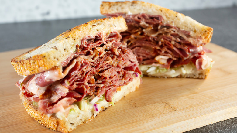 Pastrami on rye is beyond iconic. It's New York's top sandwich, and the name alone is enough to bring to mind old-school delicatessens in New York City where plates piled high with slices of pastrami, pickle spears, and chips were a common sight. The sandwich usually consists of several slices of pastrami topped with mustard on rye bread, although some non-kosher variations include cheese.