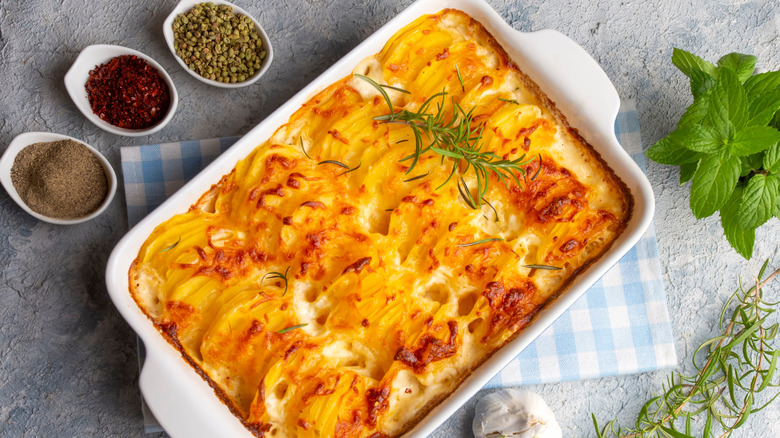 Given that these dishes have so much in common, it's easy to consider them interchangeable. But as it turns out, there are distinctions — and some that might make a real difference to your guests and fellow diners. Perhaps the most notable being another beloved ingredient: cheese. Although scalloped potatoes can sometimes feature an optional topping of the gooey stuff, the strictly traditional recipe goes without. Au gratin, on the other hand, is a decadent dish that does feature a good dose of cheese layered in.