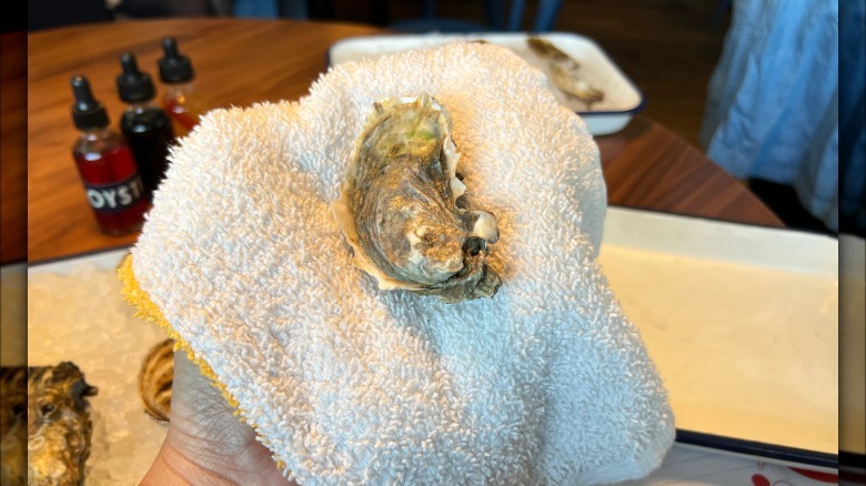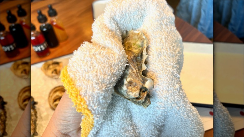 Step 2: Protect your hand with a kitchen towel and position the oyster
