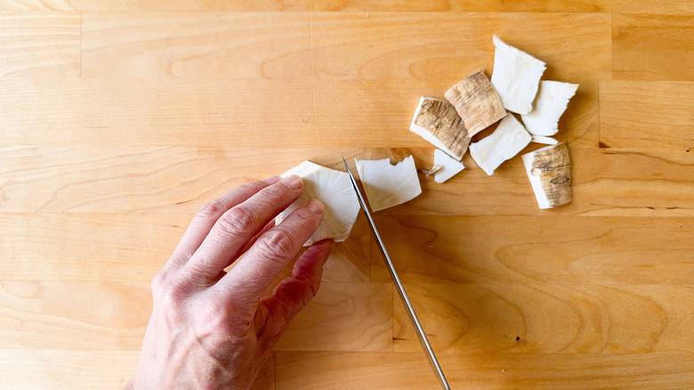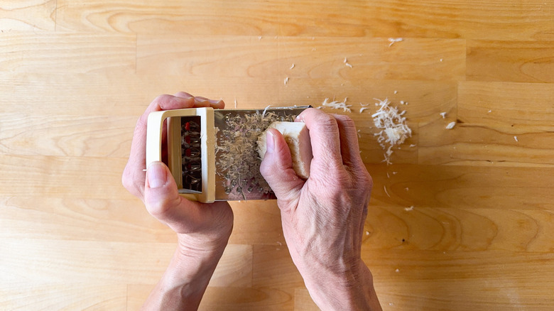 - Grate enough horseradish to measure 2 tablespoons. Set aside.