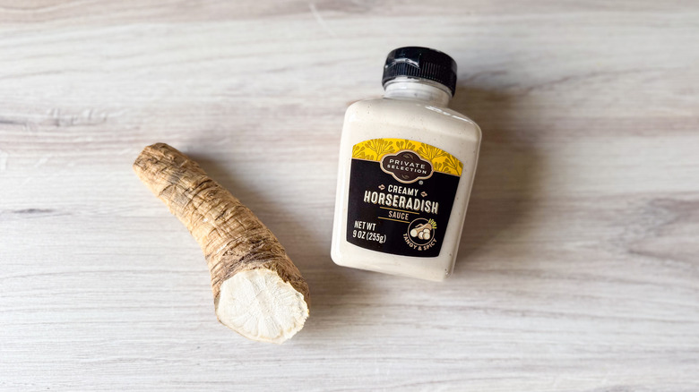 Prepared horseradish — AKA the creamy stuff you might find in the condiment aisle — has a more tempered flavor, as the freshly grated horseradish flesh is soaked in vinegar. This halts the enzymatic process in the root that produces the heat and spice, while still preserving the flavor. Creamed versions of prepared sauce may also contain sugar, egg, and other spices to balance the intensity of the root. Using freshly grated horseradish in recipes will give a distinct boldness of flavor, but also add a bitter edge. The prepared horseradish sauce should be used when you want a more subtle flavor in your finished product.