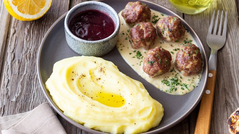 Samuelsson's grandma Helga was the mastermind behind his favorite holiday dish, which she paired with mashed potatoes and gravy, he shared with Today. Swedish meatballs are distinguished by their smaller size and gravy-like sauce, as opposed to the tomato sauce that tops Italian meatballs. But ironically, the savory dish likely didn't originate in the northern country. Rather, it migrated from the Ottoman Empire, where modern-day Turkey lies, to settle in its forever home in Sweden. Scandinavians like Samuelsson aren't going to let their now traditional cultural dish go anytime soon, but they're more than willing to share it with the world. And if you haven't had them before, IKEA's Swedish meatballs are so cheap it's almost a crime not to try them at least once.