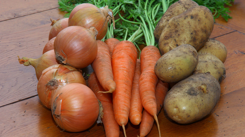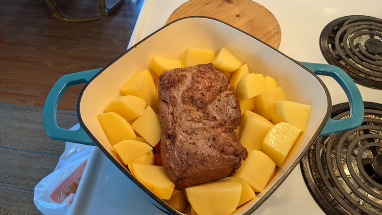 Fortunately, there are plenty of other vegetables you should be cooking with pot roast, and root vegetables are a great place to start. The term root vegetable refers to vegetables that are grown underground, like carrots and onions, which are commonly found in pot roast recipes. You should also consider others like rutabaga, parsnips, and turnips. Each will add their own nuanced flavor to your roast. Whichever vegetables you choose, chop them evenly so they'll cook in the same amount of time, and resist the temptation to add them all to your roast at once. Instead, think about each vegetable's cooking time and add those that take the longest first.