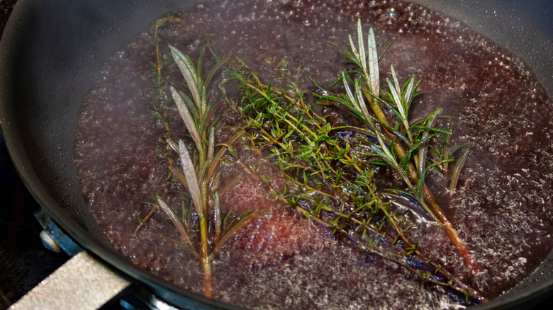 While broth, stock, or water are common choices for deglazing a pan, using only broth is a big deglazing mistake when cooking pot roast. When you're ready to deglaze, grab an acid like wine, vinegar, or citrus juice to level up your sauce even more. Using an acid is the best way to deglaze a pot roast. It can enhance the flavors already present in your roast, adding a brightness and balancing the richness of the meat. Wine will give your pot roast the perfect blend of acidity and a subtle sweetness. Citrus juice can have the same effect. It enhances the flavor without the alcohol. Consider other acidic liquids as well. You might be surprised to learn you can even deglaze pans with Coke and vinegar. All of these will give your pot roast a wonderfully layered flavor.
