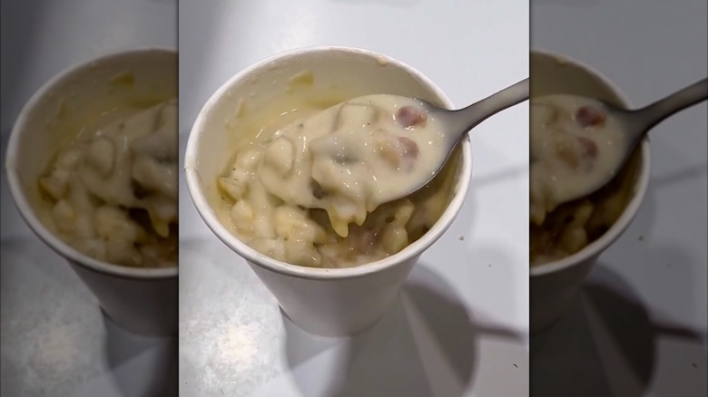 Wayne Dang, a known food reviewer on TikTok, shared a clip spooning through a cup of the soup. Each time he stirred, an abundance of ingredients was shown, revealing the soup's pleasantly chunky texture and runny liquid base. Dang praised the dish and said the "flavor is spot on" with a "generous amount of clams" and a "good amount of potatoes." He described it as "nice and tender" and overall being "very creamy with a clean seafood taste." What more could you ask for in a clam chowder soup?