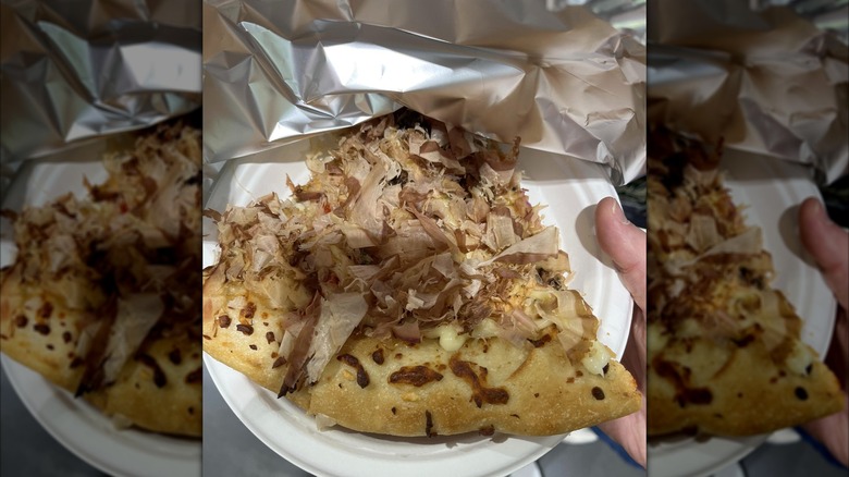 China's seafood pizza is modeled after Japan's okonomiyaki, a pan-fried dish that resembles a generously loaded, savory pancake. It consists of a fried batter, topped off with a variety of ingredients that can be adjusted according to your preferences. This can include anything from meat and dried seaweed flakes to pickled ginger and cabbage. The pizza sold at Chinese Costcos takes the seafood route, providing customers with slices or whole pies adorned in octopus, fish flakes, green peppers, corn, and Kewpie mayo.