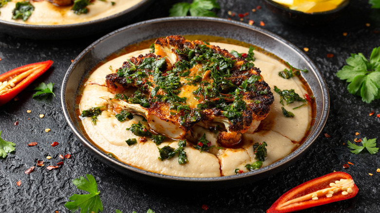For an aesthetic visual, include a protein-packed spread upon which you can place your cauliflower steak. This is where you can explore your creativity further with different flavors to feature different cuisines on the plate. A black bean hummus incorporates a Southwestern flair to the dish, while a nutritionist-approved version featuring a silken tofu and sweet potato purée with a beetroot tahini dressing infuses autumnal notes to a balanced dish. At the end of the day, celebrate the opportunities to explore the endless possibilities of the humble cauliflower for a hearty, flavorful, plant-based meal.