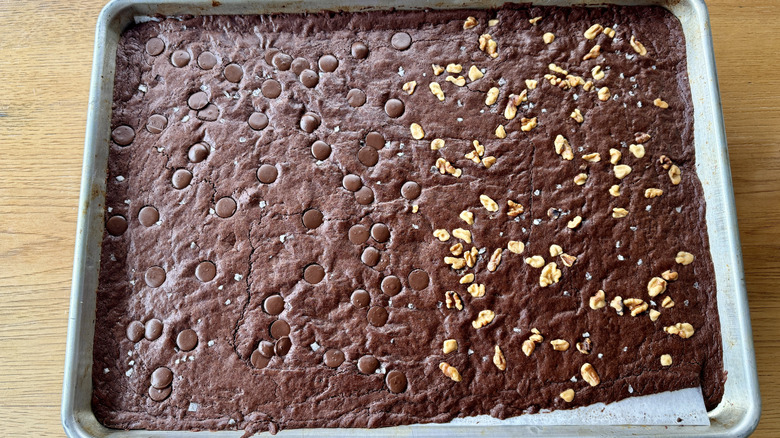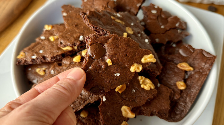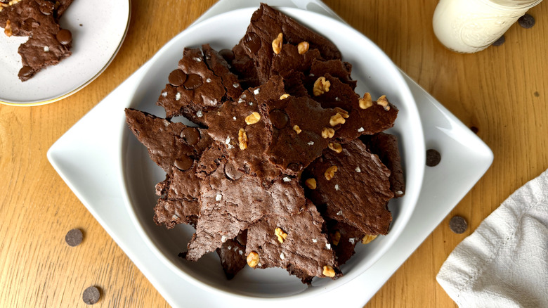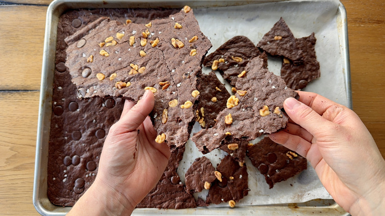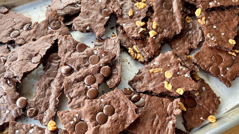 Fudgy, cakey, served warm, or topped with a scoop of ice cream, there's just no wrong way to enjoy a batch of brownies. But what about brownie brittle? In recent years, brownie brittle has become a new chocolatey favorite, taking all of the goodness of brownies but transforming it into a crispy, crunchy little treat. Inspired by the crispy edges of brownies, which some people consider the best part, brownie brittle is for all those who can take or leave the gooey center pieces and much prefer a little bite in their treats.